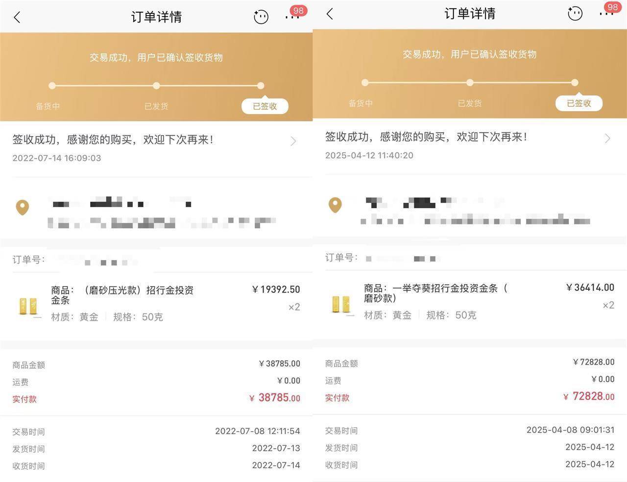 “工资的开户行就在这所银行,在手机上就可以直接操作,非常方便。”余教授拿出手机,点开银行App,就可以很方便地进行购买。以2022年的一次购买经历为例,他当时花了38785元购买了规格为50克的金条两根,每克单价为387元。最近的一次购买价经历则在今年4月8日,这次还是两根50克的金条,总价则为72828元,每克单价为728元。